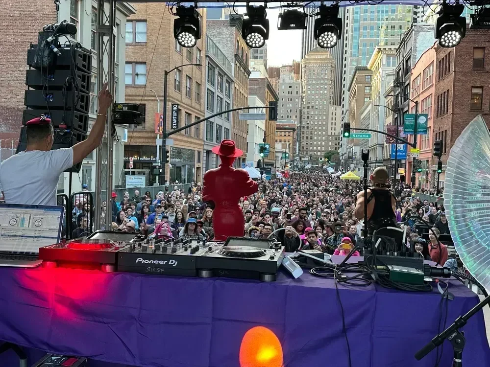 Free · All Ages · Rain or ShineEvery first Thursday of the month, a stretch of 2nd Street between Market and Howard transforms into a full-blown block party. We're talking DJs, drag performances, food trucks, live music, a karaoke stage, art pop-ups, and what they proudly call "the biggest disco ball west of the Mississippi" at the Discoteca on Jessie Street. The happy hour kicks off at 5 PM with $8 beers and $10 margaritas at the outdoor bar, and the party runs until 10. It's legitimately one of the better things this city does — 300,000+ people have shown up since it launched in 2024.